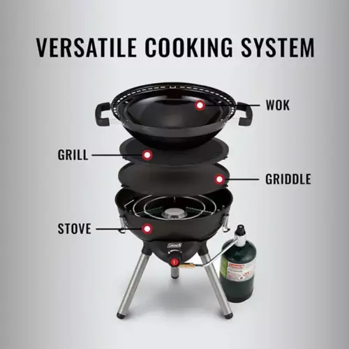 The Coleman 4-in-1 Portable Propane Gas Grill is a versatile camp stove perfect for all your travels. This portable Coleman grill comes with three interchangeable inserts—a stove, a wok, and a reversible griddle/grill—so you can prepare a variety of meals. An Instastart™ push-button ignition offers quick matchless lighting. Plus, the 4-in-1 Coleman grill is extremely portable: just remove the legs, store them in the inverted wok, and latch the lid for compact, convenient portability! Whether you’re heading out camping or hitting the beach, cook a variety of delicious meals on the versatile Coleman 4-in-1 Portable Propane Gas Grill.