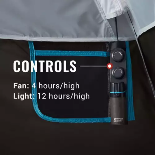 Part of a system that powers outdoor gear, the OneSource 4-Person Camping Dome Tent with Airflow System & LED Lighting lets you enjoy time outdoors with friends and family comfortably. An integrated fan refreshes the air in the tent 6 times per hour to reduce humidity, and LED lighting offers warm diffused light throughout the tent. The lithium-ion battery can be conveniently recharged from wall outlets, vehicles, universal power packs, or other OneSource batteries with the included USB cord. Bonus? The OneSource battery helps eliminate the need for multiple power sources by letting you charge external devices, like smartphones or tablets (not included), through a USB port, even while powering gear. One system, one source, power anywhere!