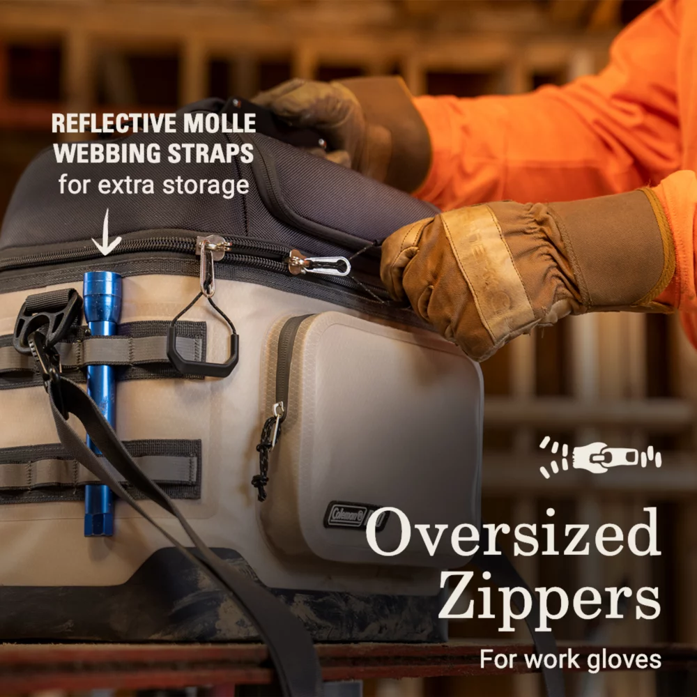 Coleman Pro is gear that works hard like you. It is purpose-built for everyday use in the most demanding environments. The Coleman Pro 24-Can Soft Cooler will keep your lunch and drinks for the crew cold all day. A separate dry storage compartment is a handy spot to store keys, phones, and more. Built tough, the durable exterior is puncture resistant and backed by a 3-year limited warranty. The antimicrobial treatment to the interior helps protect it from odor causing bacteria while a compression molded base protects the soft cooler to help prevent leaks. Throw the Coleman soft cooler over your shoulder to keep your hands free to carry toolboxes or fishing gear. Work smarter, not harder with oversized zipper pulls for easy access in work gloves and reflective molle webbing for extra storage.